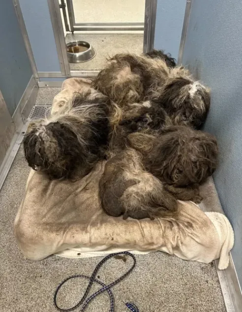 The moment the crates opened, the smell of neglect filled the room. Fur was matted over eyes and twisted around paws. Dirt clung to every strand. Yet beneath it all were tender souls who had survived together.