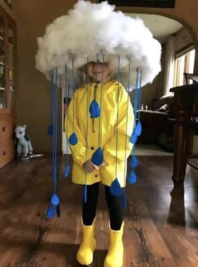 Sophie wanted to be a rain cloud. That seemed impossible, until I remembered I had some fluffy stuffing (polyester batting) from an old project. We found a yellow raincoat at Goodwill for eight dollars. Then we got blue felt and ribbon at the dollar store. The total cost was twelve dollars.