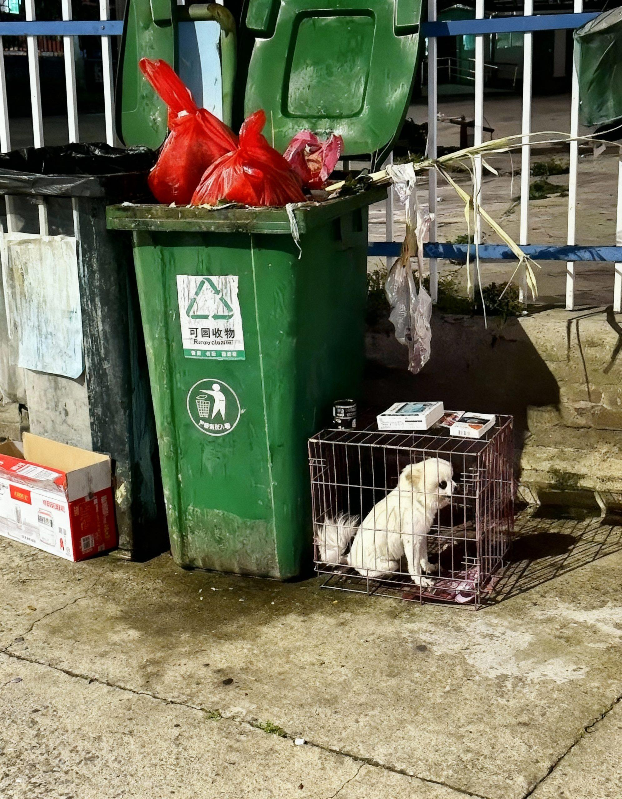 Wedged between the steel bin and a sagging fence was a small wire cage. Inside it, pressed against the bars with matted fur and trembling limbs, sat a tiny white puppy: terrified, abandoned, and clinging to hope in the shadow of garbage.
