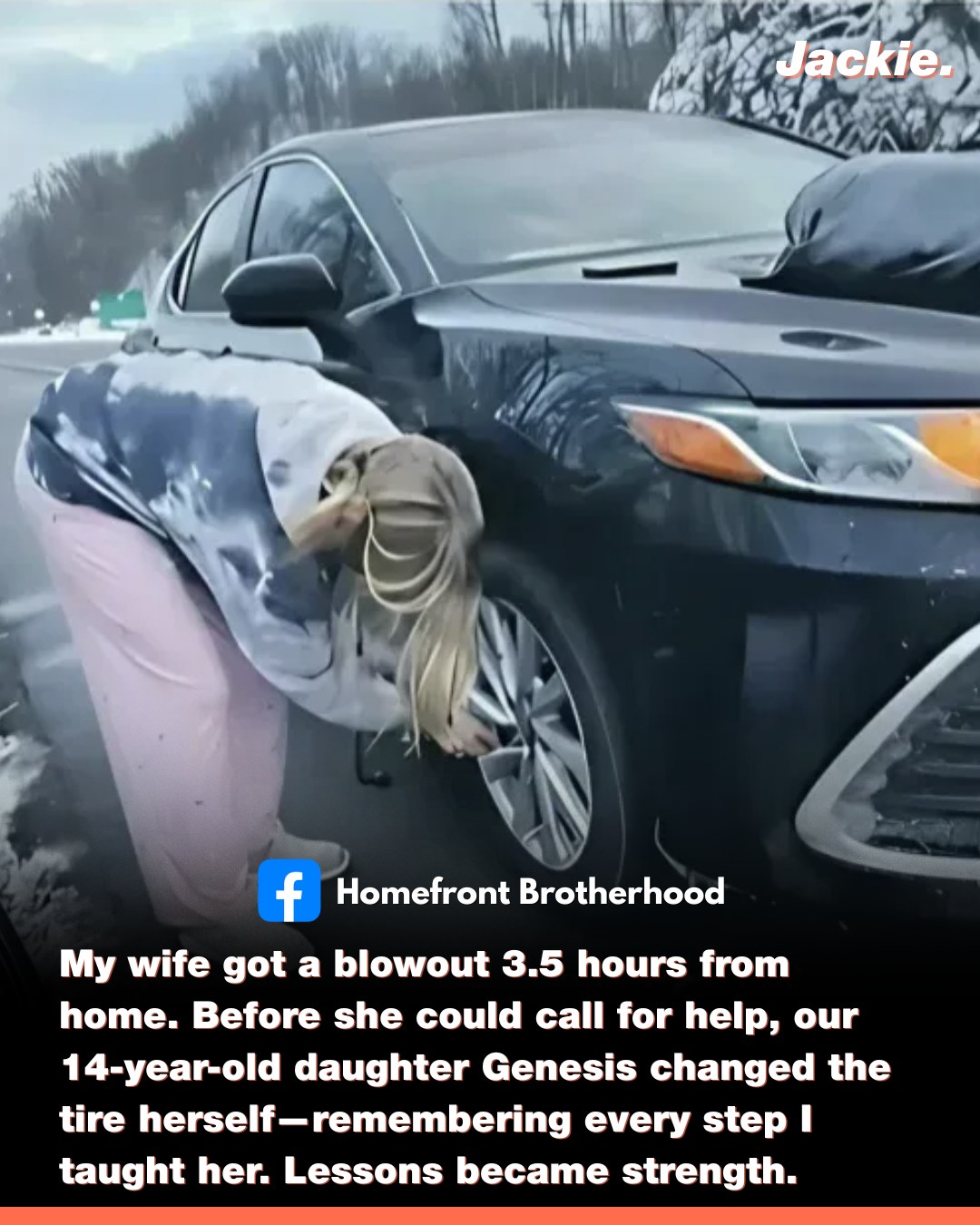 Before she could even call for help, our 14-year-old daughter, Genesis, got out and started changing the tire. No hesitation. No panic. Just confidence. She remembered every step I’d taught her.