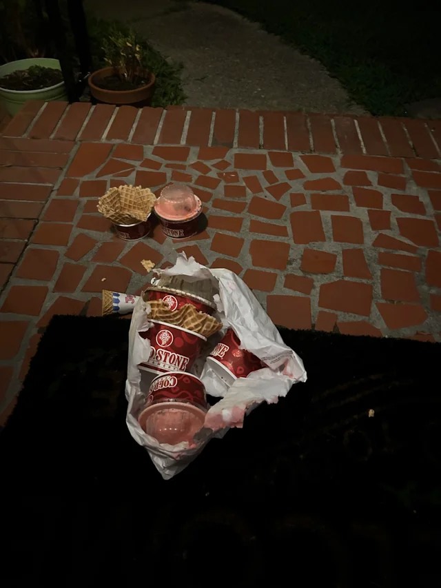 Ordered ice cream for the family while having a game night. I watched the dasher through my ring doorbell dump the bag with his friend and they were laughing about it. Then they ran back to their car and did one of the weakest burnouts to pull away from the house. I would have felt better if they had just told me they lost the order πŸ˜‚ wish I could post the video for you guys. DoorDash didn’t even give me a full refund for it either ☠️