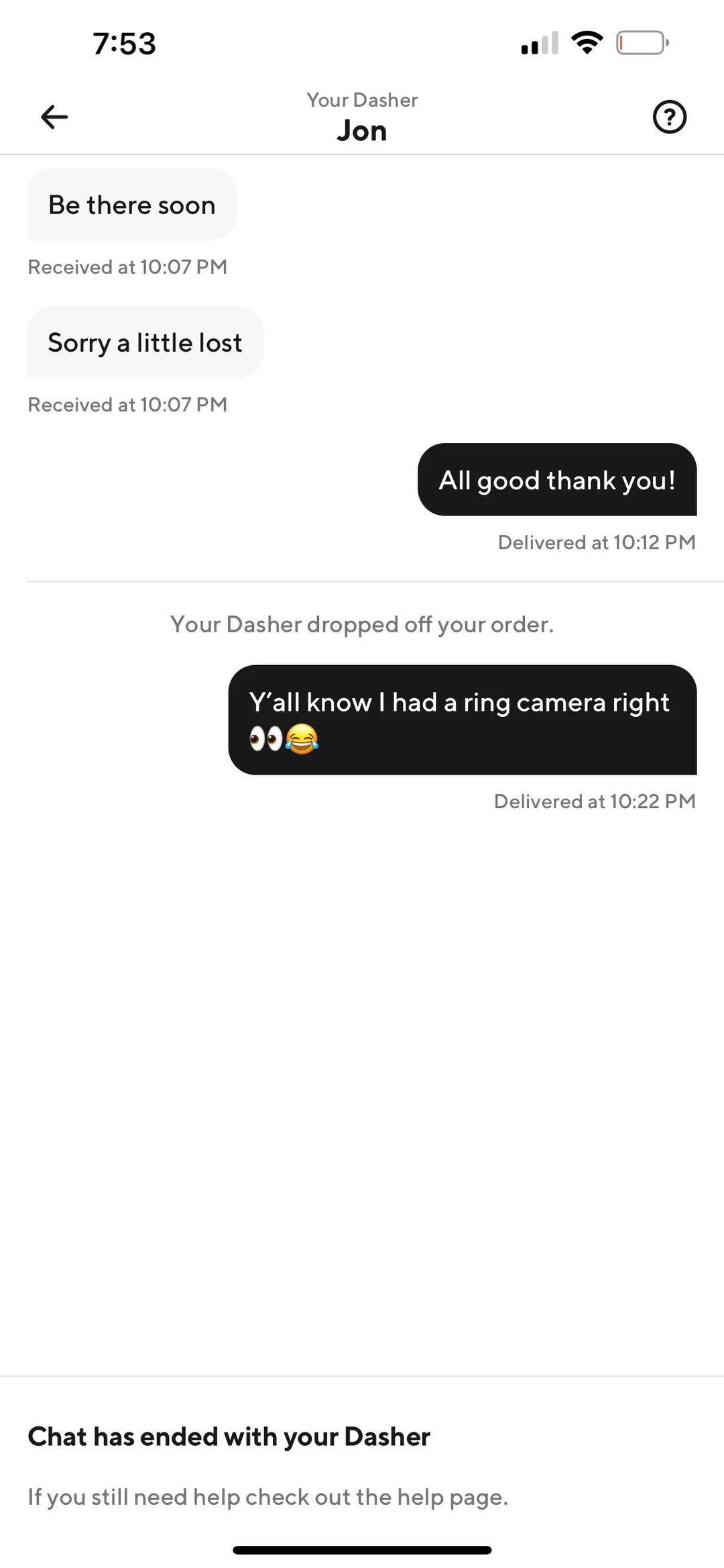 Ordered ice cream for the family while having a game night. I watched the dasher through my ring doorbell dump the bag with his friend and they were laughing about it. Then they ran back to their car and did one of the weakest burnouts to pull away from the house. I would have felt better if they had just told me they lost the order πŸ˜‚ wish I could post the video for you guys. DoorDash didn’t even give me a full refund for it either ☠️
