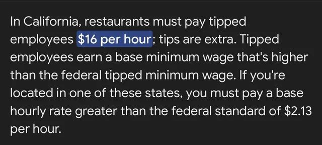 As of this year servers in California are paid 16 an hour by their employers. I think it’s safe to say that tipping should be at least optional in California. If not a thing of the past.