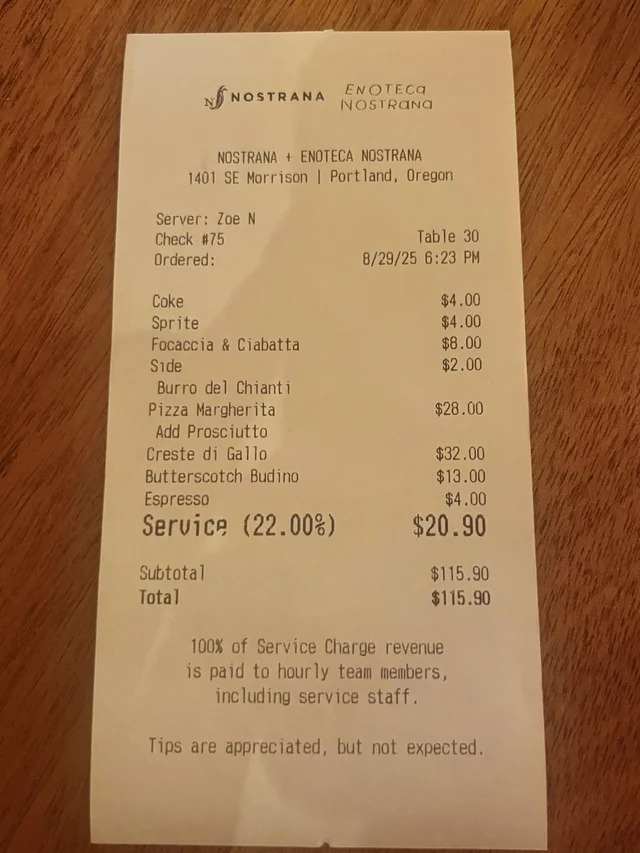 I very much appreciated that the automatic service charge was in a huge font on my receipt. The menu also noted it beforehand, saying that the restaurant wants to make sure its staff is paid. Not quite the same as just including their wage in the food prices, but still better than slipping it in, hoping that I wouldnβt noticed, and demanding a tip on top of it!