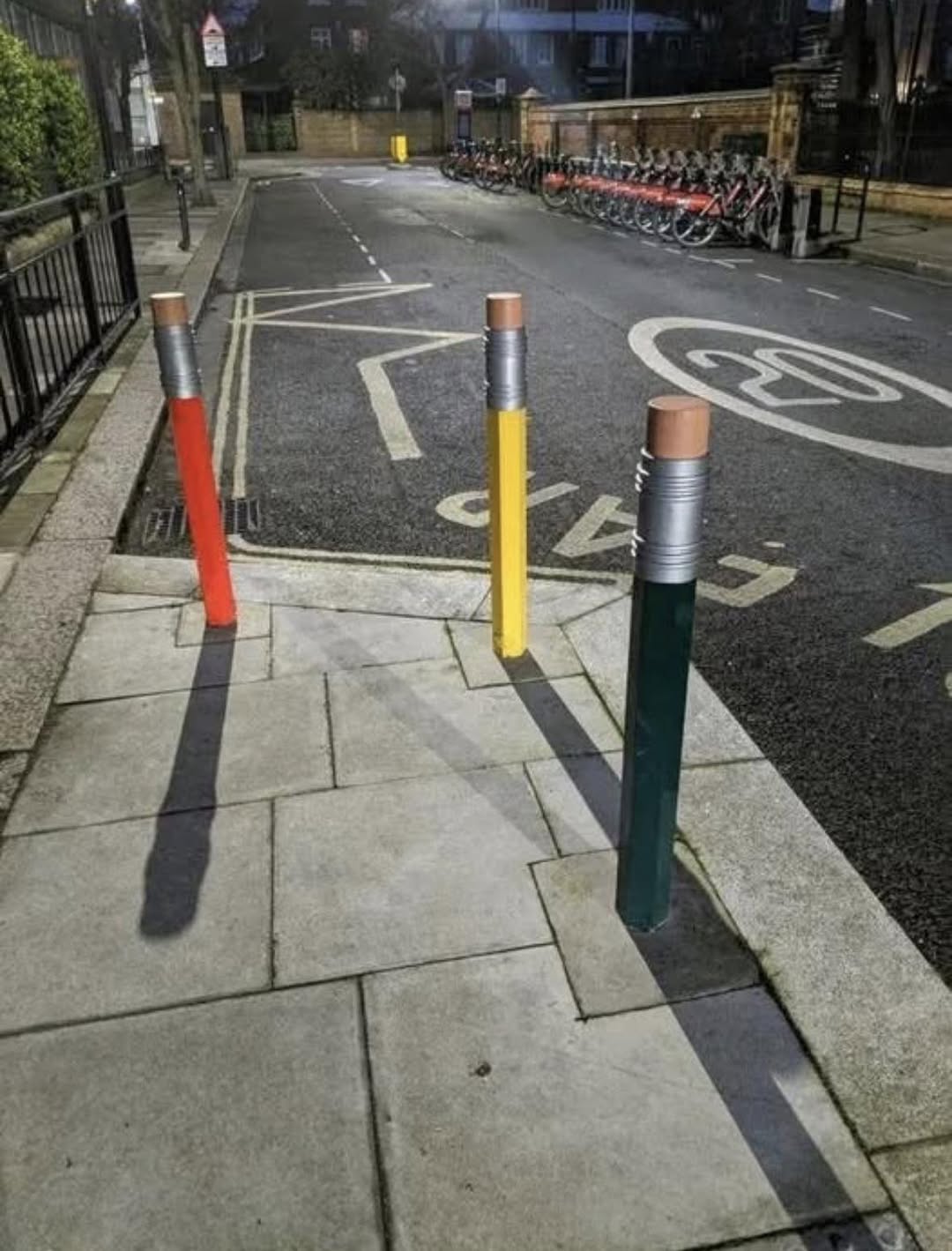 My sister texted me this photo yesterday with zero context and I genuinely thought she’d lost her mind. Turns out she spent three entire weekends painting traffic bollards outside her elementary school to look like giant pencils because “the kids deserve whimsy on their way to standardized testing.”