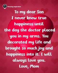 To my dear son ๐ I never knew true happiness until the day the doctor placed you in my arms ๐ถ You filled my life with love, joy, and endless smiles ๐ Iโll always love you โค๏ธ Love, Mom ๐